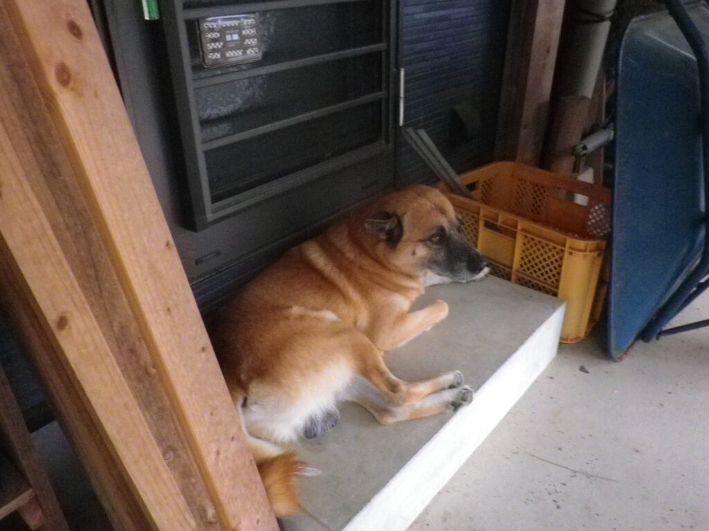 裏口のドアの前に陣取る時は家に入りたいか出たいかですが、この時はこの場所に居たいという珍しいものでした。
