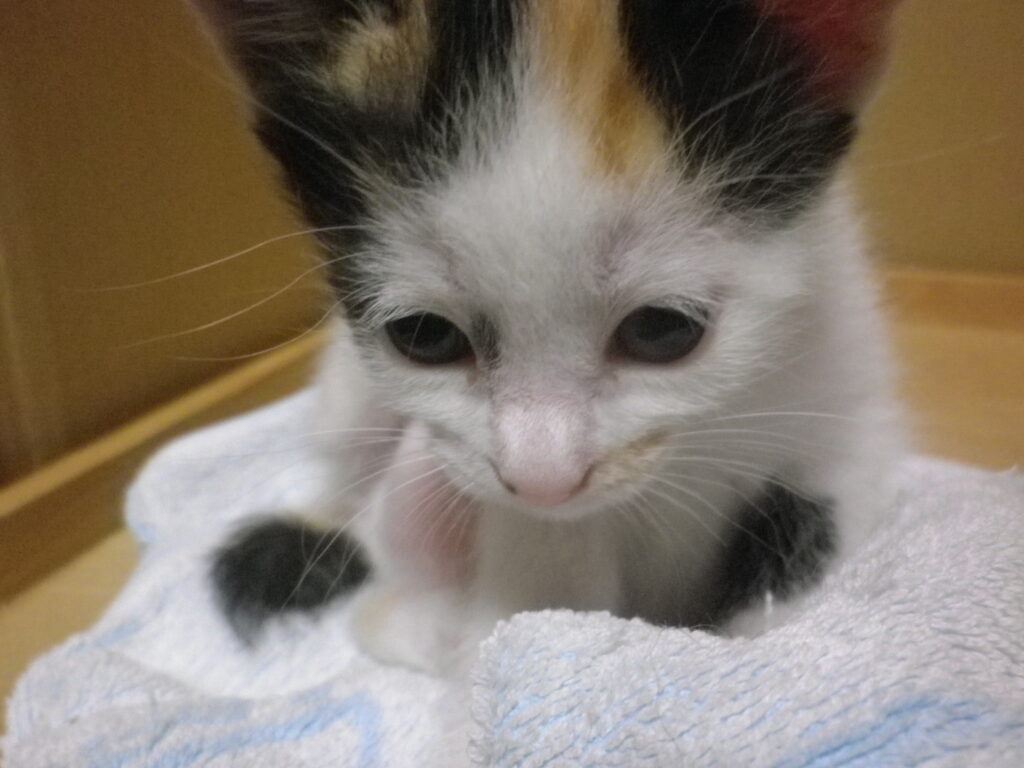 生まれたばかりの子猫なのに、模様によってばあちゃん味がにじみ出ている一枚。