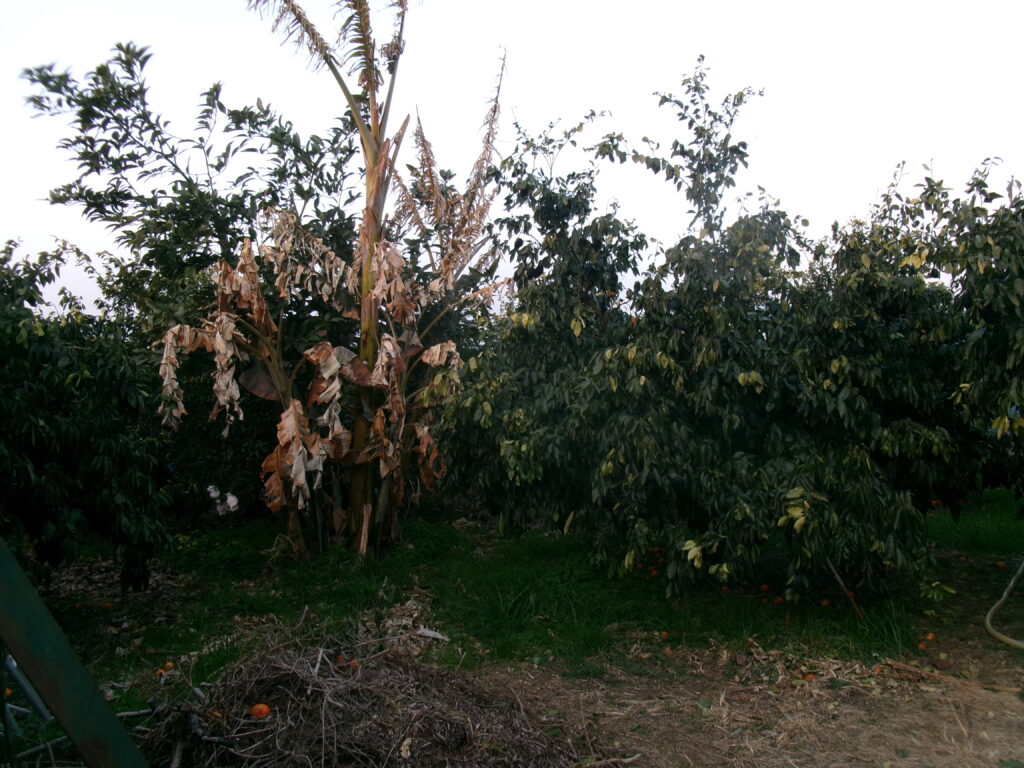 バナナは必ず枯れて、また元気な緑になるのですが、この姿を初めて見た時は心配になりました。